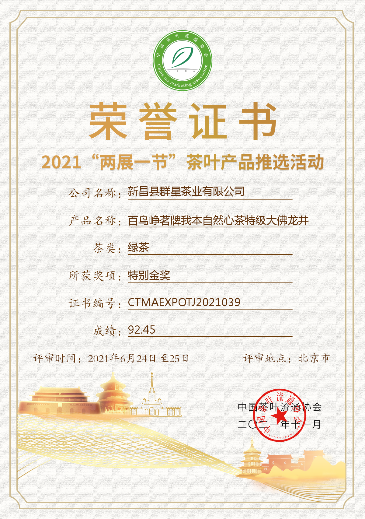 2021年11月,“百鸟峥茗牌我本自然心茶特级大佛龙井”荣获2021“两展一节”茶叶产品推选活动中荣获特别金奖;