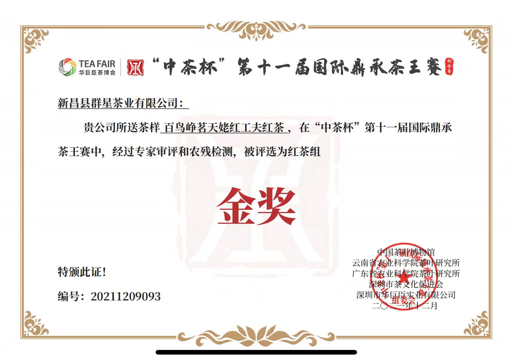 2021年12月,中茶杯十一届国际鼎承茶王赛 百鸟峥茗天姥红工夫红茶荣获红茶组金奖