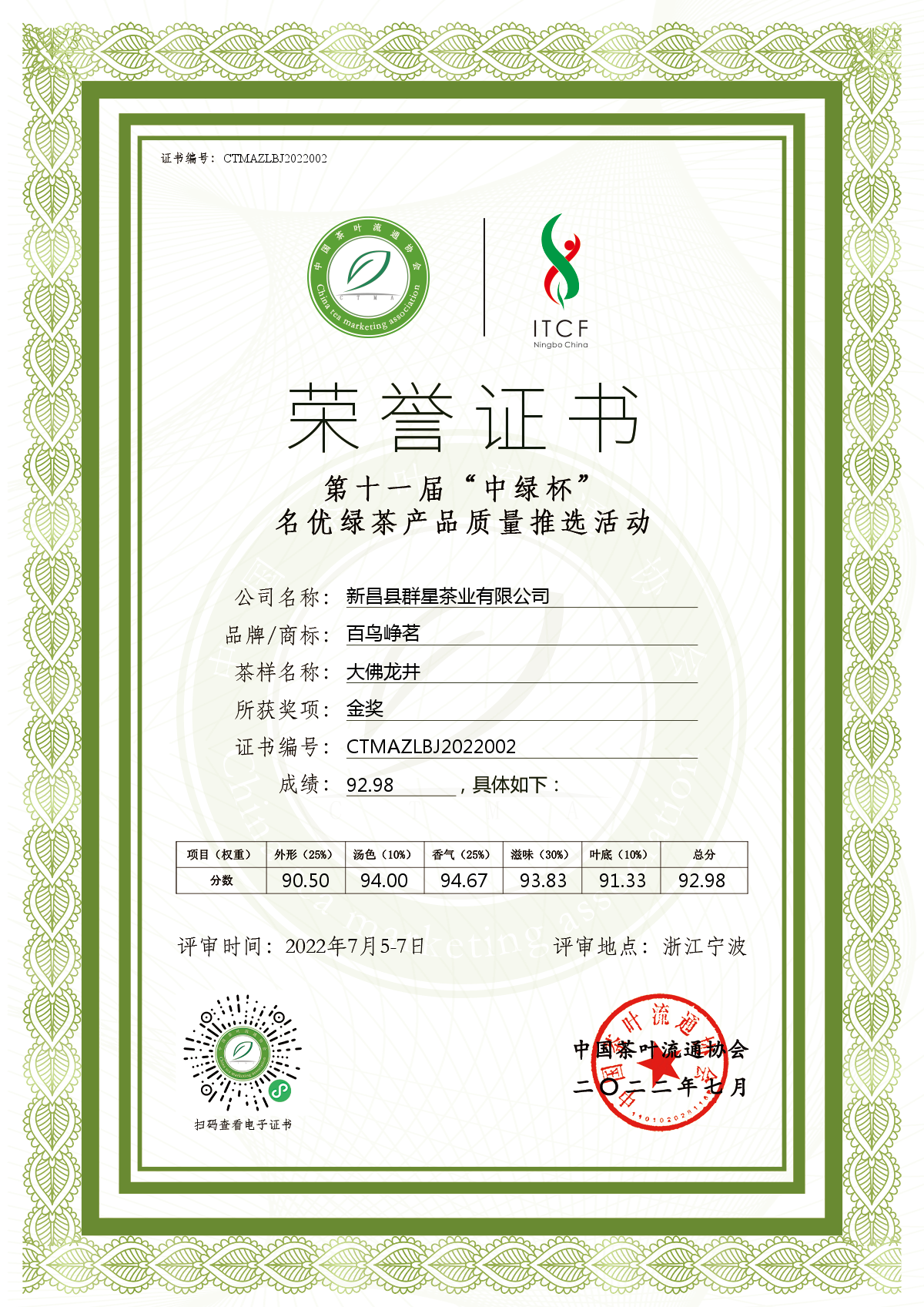 2022年7月,第十一届“中绿杯”名优绿茶产品质量推选活动中,百鸟峥茗大佛龙井荣获金奖;