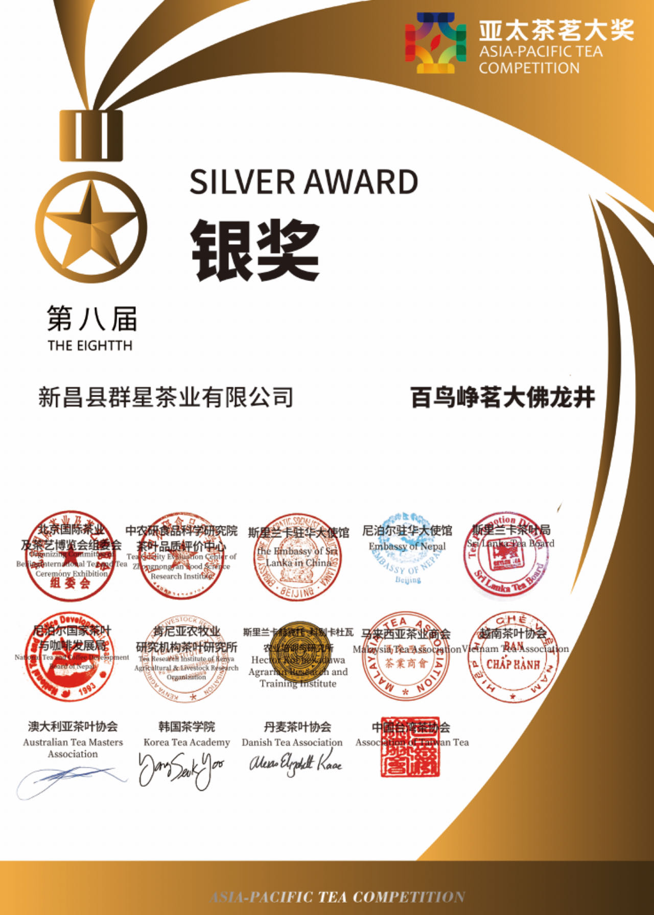 2023年6月,在第八届亚太茶茗大奖活动中,百鸟峥茗大佛龙井荣获银奖