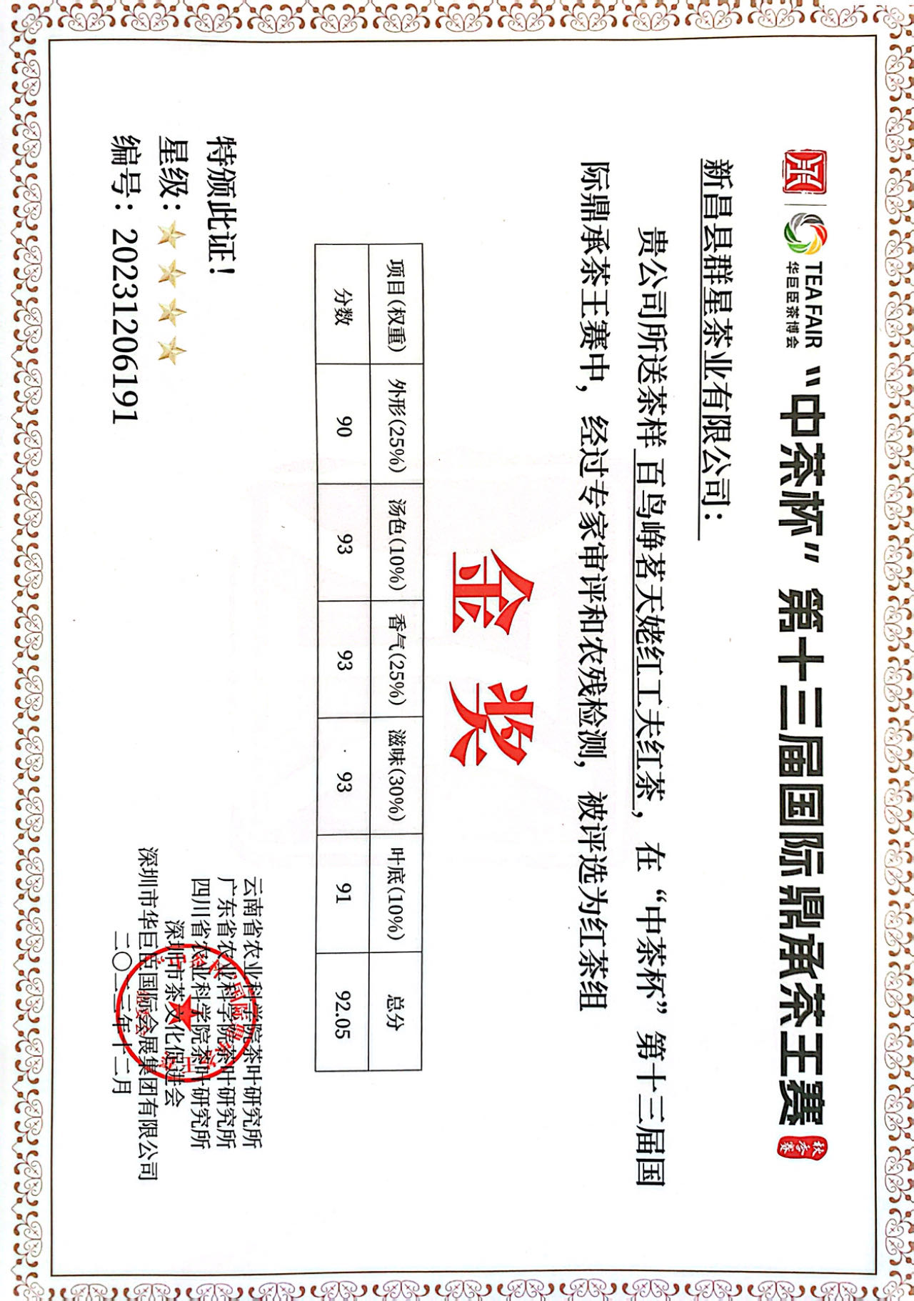 2023.12百鸟峥茗天姥红工夫红茶,在中茶杯第十三届国际鼎承茶王赛中荣获红茶组金奖